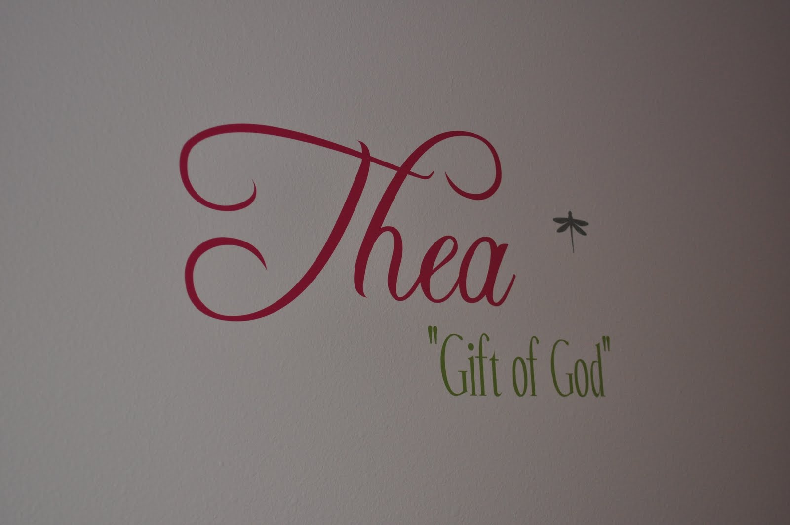 I am winding down the week of Thea with a shot of her bedroom wall. Both of the girls have some uppercase living decals up in their rooms, and that is about it for decorations. I put these up in their rooms the day we closed on the house, before the girls had even been in their finished rooms yet. Gift of God is the Greek meaning of Thea's name. Wait for April and the week of Leila for a shot of her special decorations too!